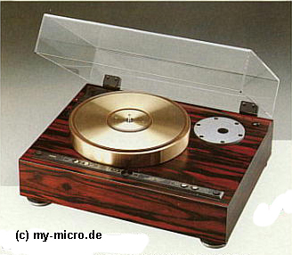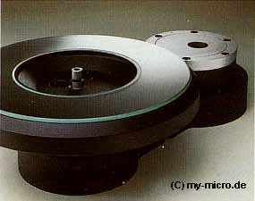 Massentraegheitsmoment: 1,5 t/cm2, mit Luftlagerung und Vakuumansaugung. Ein grosser Vorteil der Luftgelagerten Teller: der Rumpel-Geraeuschspannungsabstand liegt bei >80 dB. |